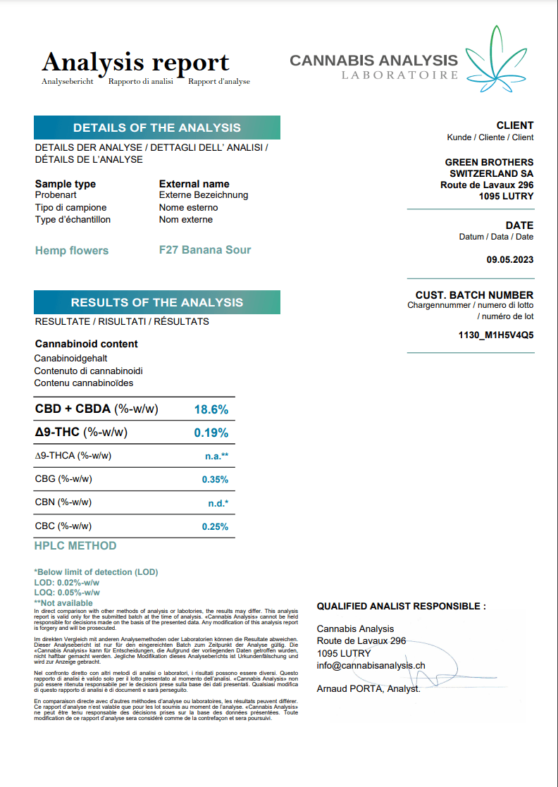 Jeder Bericht enthält detaillierte Informationen zu Analyseart, Ergebnissen und Cannabinoidgehalt. Prüfen Sie den Laborbericht sorgfältig und erfahren Sie mehr über unsere Produkte!